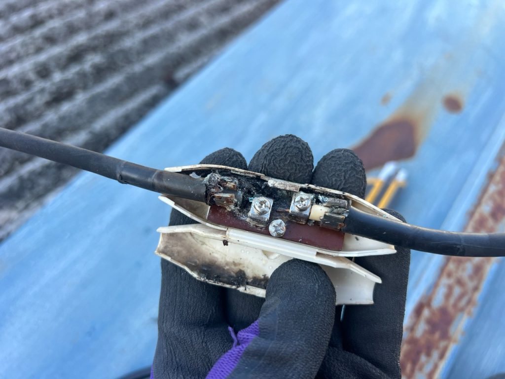 浸水によるショートで芯線が溶けて途切れている状態でした。